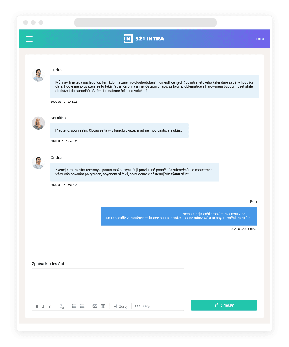 The basis of corporate chatting is a clear identification of individual participants. Everyone has a name and avatar, so you can immediately see who you're writing to. For all messages, you always see the date and time of publication. If you want to invite or remove some conference participants, you can do so easily.